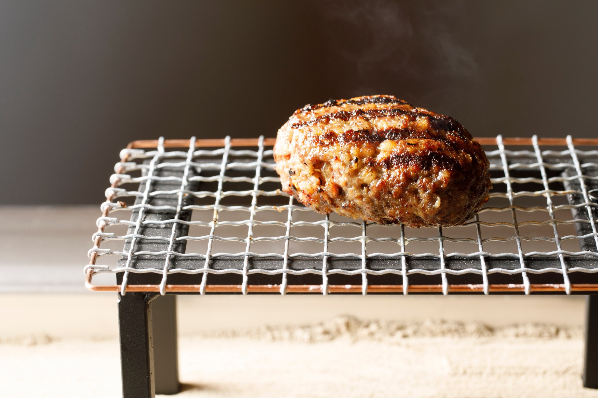 「たてはん」の炭火ハンバーグは、国産牛を100%使用 1つ1つ丁寧に手ごねで形を整え、お肉本来の旨みをとじ込め 柔らかく、ふっくらと焼き上げています。 「炭火ハンバーグ定食」を是非ご賞味ください。